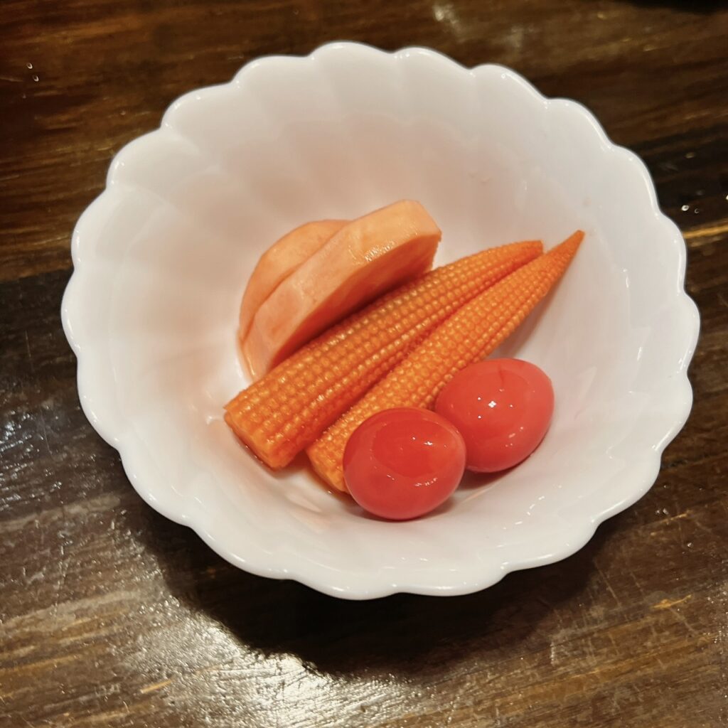 カブ、ニンジン、アーリーレッド、筍、ヤングコーン、エリンギ、うずら玉子など日替わりでご用意。