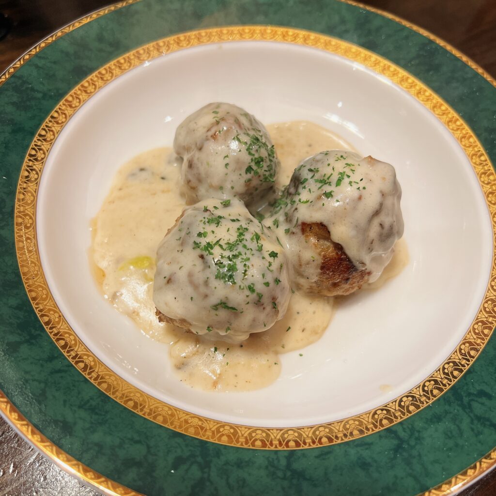 異なる部位の3種類の豚肉で作ったミートボールにベシャメルソースをたっぷりかけました。