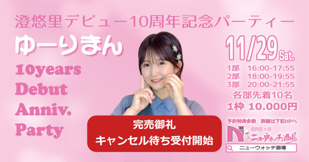 2025.11.10 【満席御礼・キャンセル待ち受付スタート】澄悠里(ゆーりまん)デビュー10周年記念パーティー お知らせ おかげさまで、澄悠里(ゆーりまん)デビュー10周年記念パーティーは満席となりました。これよりは、キャンセル待ちのみの受付となります。イベント案内ページはこちら各部毎にごお申し込みください。キャンセルが出た場合は、整理番号順にご連絡します。 ■ キャンセル待ちしたいイベント名を確認しチェックしてください 11/29 澄悠里(ゆーりまん)デビュー10周年記念パーティー ■ 氏名:必須:ご本名(フルネーム) ■ 携帯番号:必須 (メール受信できない場合などショートメッセージでご連絡させていただく場合があります) ■ メールアドレス:必須 (ドメイン @bar.newwatch-pro.com を受信できる設定にしてから送信ください) ■ ご希望枠確認(1つ選んでください)必須 1部のみ|16:00-17:552部のみ|18:00-19:553部のみ|20:00-21:55 ■ メッセージ欄:(任意) キャンセル待ちは、各部毎にご予約ください。 キャンセルが出た場合は、整理番号順にご連絡します。 ■ キャンセルポリシー・プライバシーポリシーをご理解のうえ、「同意します。」にチェックを入れて送信してください。 同意します。 澄 悠里(ゆーりまん)デビュー10周年記念パーティー Post Share Line Pocket Pin it この記事のタイトルとURLをコピーする 感謝!ビチ誕 前の記事 【12/21】M-1グランプリ2025 観戦DAY 次の記事