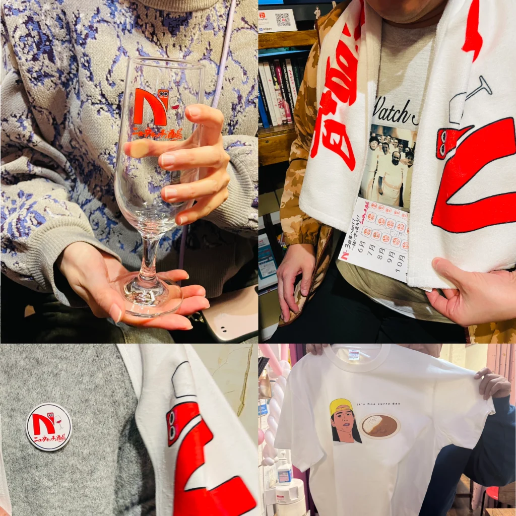 ロゴ入りグラスやTシャツ、タオル、常連の画伯にデザインしていただいた缶バッジやグラスマーカーなど、たくさんのオリジナルグッズを作りました。